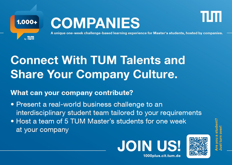 - Die „1.000 +“-Teams werden im Juni 2026 auf einer gemeinsamen TUM-Veranstaltung ihre Poster präsentieren. Unternehmenspartner sind eingeladen, mehr über die TUM und ihre Organe zu erfahren und sich zu vernetzen.
