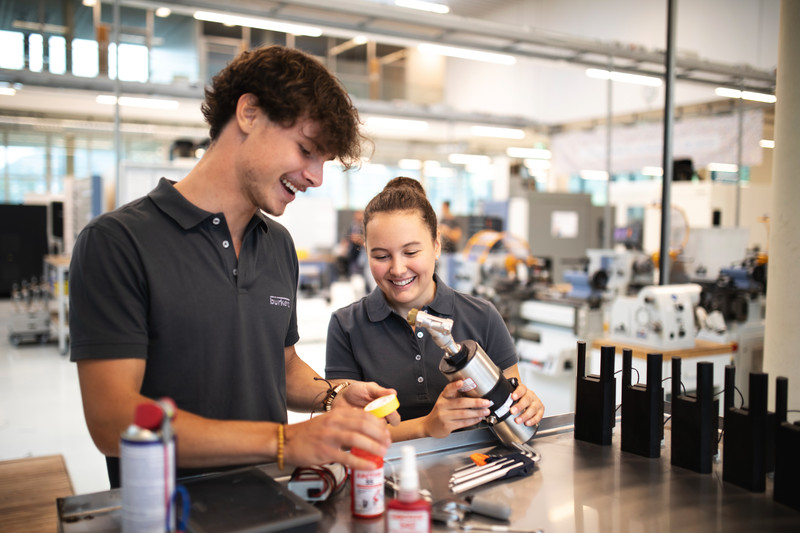 Das Wirtschaftsmagazin Capital hat Bürkert wiederholt als einen der besten Ausbilder Deutschlands ausgezeichnet. Doch was macht die Ausbildung bei Bürkert so besonders? Das Bürkert-Ausbildungsteam unterstützt Auszubildende individuell beim Herausfinden ihrer Fähigkeiten und Stärken. Bereits vom ersten Tag an lernen die Azubis und dual Studierenden, eigene Ideen einzubringen und umzusetzen – beispielsweise auf Ausbildungsmessen oder in Kundenprojekten. Für einen fließenden Übergang ins Berufsleben sorgt eine umfassende Einarbeitung im Übernahmebereich. Dass bei Bürkert fast 100 Prozent der Auszubildenden und Studierenden nach dem Abschluss übernommen werden, spricht für sich.