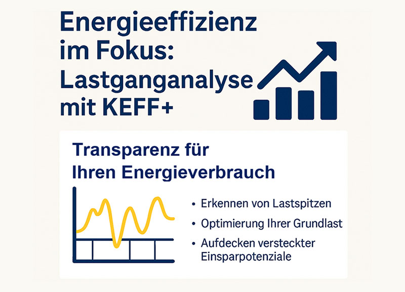Im Rahmen unserer KEFF+ Beratung unterstützen wir Sie gerne mit einer individuellen Lastganganalyse. Gemeinsam identifizieren wir konkrete Ansatzpunkte für mehr Energieeffizienz in Ihrem Betrieb – neutral, unabhängig und kostenfrei.Interessiert? Wir freuen uns darauf, gemeinsam mit Ihnen Potenziale ausfindig zu machen!