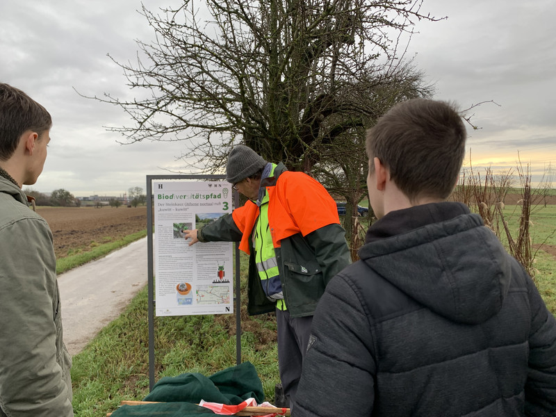 Aber das ist noch lange nicht alles: Ganz aktuell hatten sich die Marbach-Auszubildenden am 13.12.2023 an einer Aktion auf dem Biodiversitätspfad zwischen Frankenbach und Neckargartach beteiligt. Dabei erklärte der Projektleiter des Biodiversitätspfades, Dr. Jürgen Hetzler, den Azubis und Studenten zunächst in aller Ausführlichkeit, wie es um die Artenvielfalt steht, welche Bedeutung Sträucher und Bäume für unsere Natur und Lebewesen haben und nicht zuletzt, was es beim Pflanzen von Gehölzen zu beachten gilt. Anschließend legten die jungen Menschen selbst Hand an und pflanzten drei Bäume und fast 50 Wildsträucher.