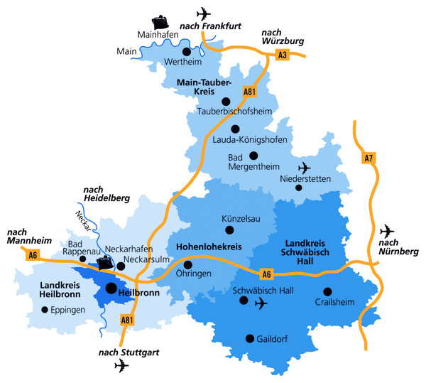 Wichtige Standortkriterien für Industrie und Handel sind neben Autobahn- und Schienennetz auch der größte Binnenhafen abseits des Rheins in Heilbronn mit einem trimodalen Containerterminal. Dieser sichert neben dem Mainhafen in Wertheim die Anbindung an die Bundeswasserstraße. Des Weiteren sind die regionalen Verkehrslandeplätze in Schwäbisch Hall und Niederstetten sowie die internationalen Flughäfen in Stuttgart, Frankfurt und Nürnberg leicht zu erreichen.
